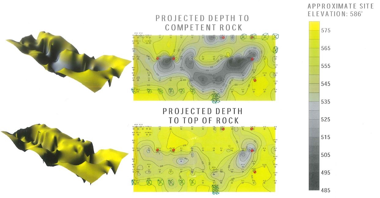 Lumen is a 6-story, 474-bed, 365,000 SF mixed-use off apartment project with 98,000 SF of parking and 6,500 SF of ground level retail space. Challenging topography is typical for this area, especially when the property previously housed a firearm distribution center. On the first day of sitework following demolition, H-pile shoring was completed, and soil nails were used to stabilize the ground. An Air Track drill was then used by a third-party engineering firm to provide soil measurements for the depth of bedrock (see image below). The depth of bedrock varied from location to location throughout the site, however the darker grey area, located in the middle, posed the largest problem with needing deeper piers. Without the use of the Air Track drill, it was difficult to determine the depth of the bedrock. Manually determining the depth of the bedrock at different locations while beginning foundations can add a significant amount of time to the schedule. Luckily, Juneau didn’t experience this with the proactive use of an Air Track drill. The building footprint is 100,000 SF and there were 96 piers, ranging from 18” – 60” wide and 5’ – 120’ deep to reach the bedrock.