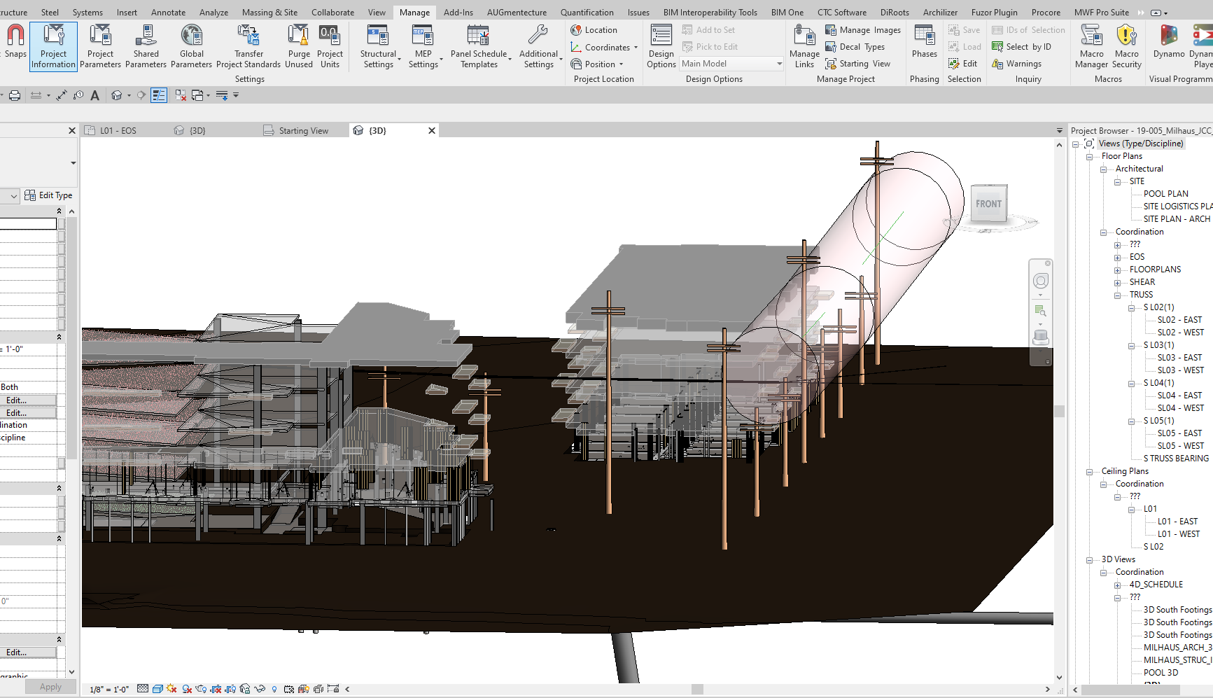 Ybor City’s newest mixed-use development, Lector 85, is comprised of two buildings, for a total of 254-units and 248,000 SF. Building one sits on the South side of the site and is a combination of 5 stories SOG and 4 stories over a podium level to support the ground retail spaces, wrapped around a precast deck. Building two sits at the North end of the site and is 4 stories SOG. Talk about challenging topography, there was a sewer main pipe running underground in the middle of the blueprint for the building. The new building’s weight exceeded the capacity limits resulting in a burst pipe if we were to move forward. To protect the sewer main, an auger cast pile was installed around it and 45’ piers were installed into the bedrock to support the building without putting pressure on the sewer main. The site is located adjacent to high voltage transmission and power lines that go directly through the City. Unfortunately, since these utility lines were running adjacent to the building under construction (see image below), it was impossible to install the skin of the building safely without the utility company shifting the lines away from the building. Juneau’s VDC department modeled the structure and utility lines to determine what distance the lines would need to be moved for the skin to be safely installed. Tying this back into the topography, with underground utilities, the project was surrounded by fiber and other LV lines that make any shovel-in-ground operations a challenge.